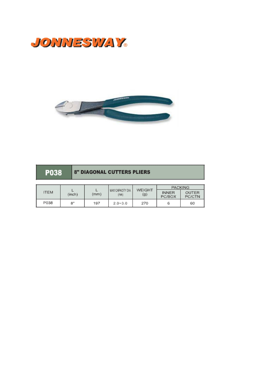 El JONNESWAY® alicate de corte diagonal 8" (197 mm) es una herramienta profesional diseñada para realizar cortes precisos y eficientes en cables, alambres y conductores eléctricos. Su diseño de corte diagonal permite mayor potencia y control, ideal para trabajos eléctricos, mecánicos y de mantenimiento.