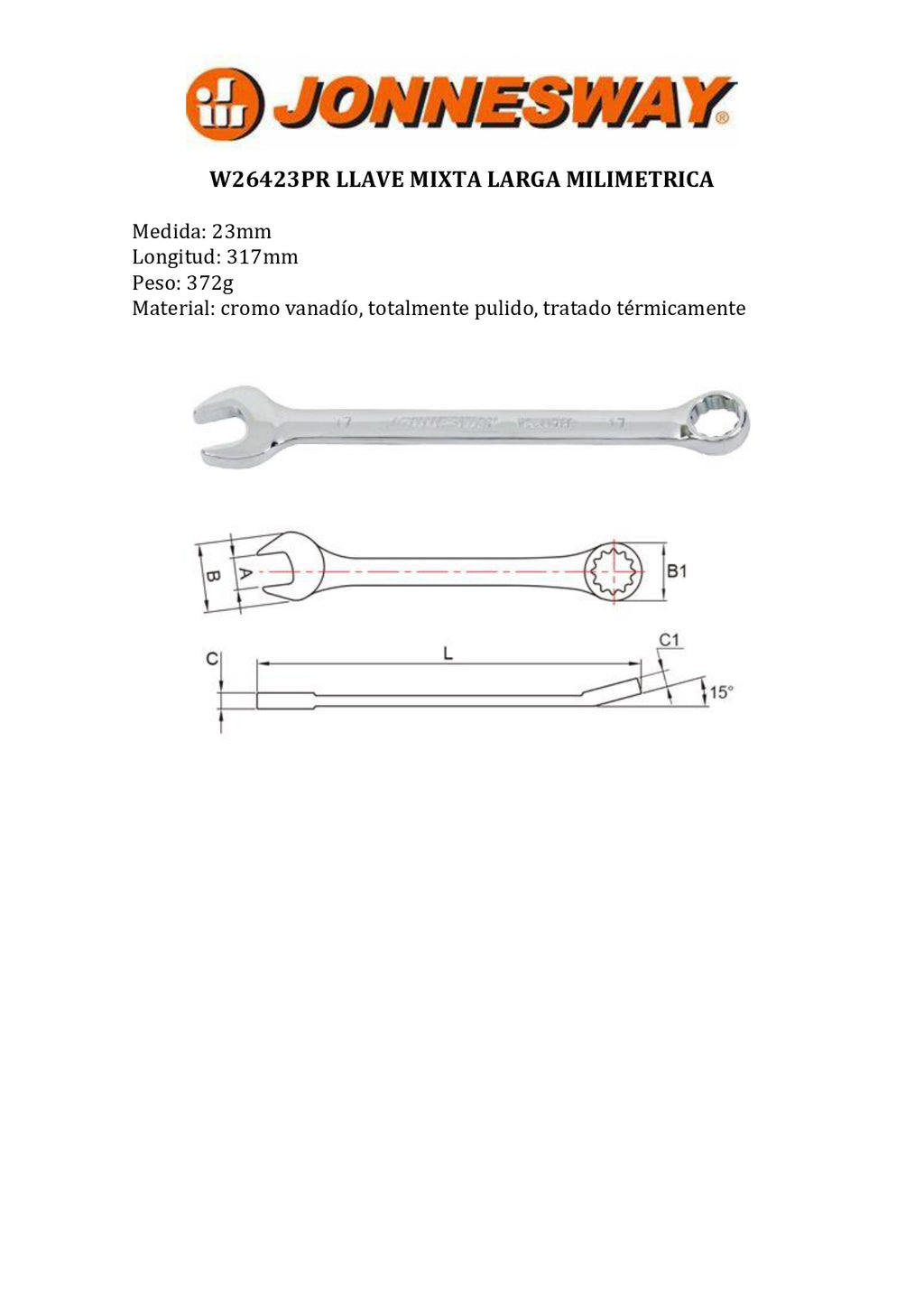 La JONNESWAY® llave mixta larga milimétrica de 23 mm con 12 puntas es una herramienta profesional diseñada para trabajos mecánicos, automotrices e industriales que requieren mayor alcance y torque. Su combinación de boca abierta y estrella de 12 puntas garantiza un ajuste preciso y seguro en tuercas y pernos, incluso en espacios reducidos.