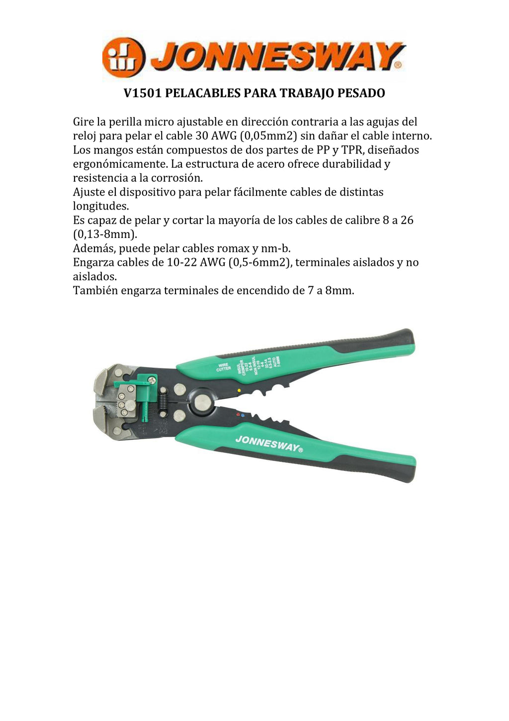 El JONNESWAY® pelacables para trabajo pesado es una herramienta profesional diseñada para pelar cables de forma rápida, precisa y segura en aplicaciones eléctricas e industriales. Su mecanismo robusto permite trabajar con distintos calibres de cable, garantizando cortes limpios sin dañar el conductor.